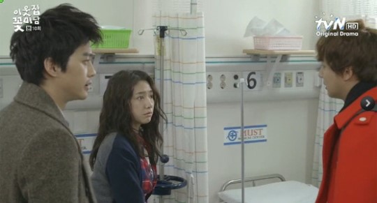 tvN月火ドラマ「となりの美男<イケメン>」夜11時放送お城に自ら閉じこもったラプンツェルのドンミ(パク・シネ)と長い間彼女のことを見守ってきた門番、ジンラク(キム・ジフン)、そして窓ガラスに石を投げ続ける通りがかりの人、エンリケ(ユン・シユン)の三角関係が揺れ始めた。スペインに戻ろうとしていたエンリケは、ドンミが危機に陥ったことを知り、韓国に残ることを決める。ジンラクもドンミのために駆けつけ、同じ場所に三人がそろった。エンリケは、ジンラクがドンミのそばにいるのをもう見たくないと宣言し、ジンラクもこれ以上、エンリケがドンミを混乱させるのは見たくないと話す。
