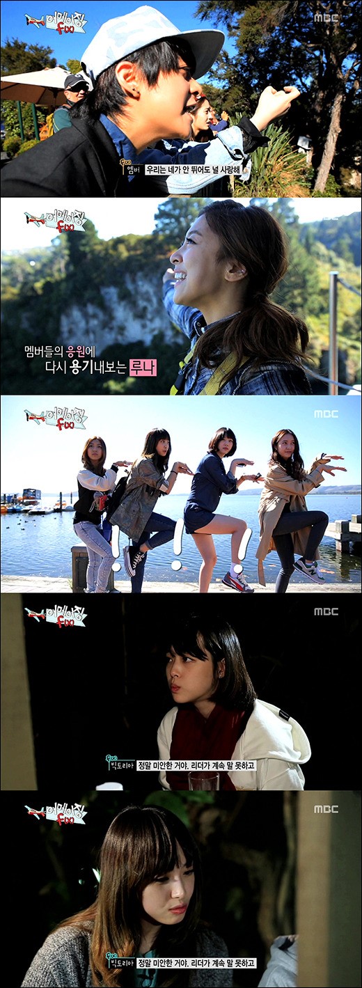 f(x)のルナはバンジージャンプ、ソルリはスキューバダイビング、エンバはヘリコプターの副操縦士、ビクトリアは羊牧場の体験、クリスタルはスカイダイビングに、各々挑戦した。この日の放送ではニュージーランドで繰り広げられたf(x)メンバーたちの多様な挑戦も興味深かったが、最も目を引いたのはf(x)メンバーたちの厚い友情だった。