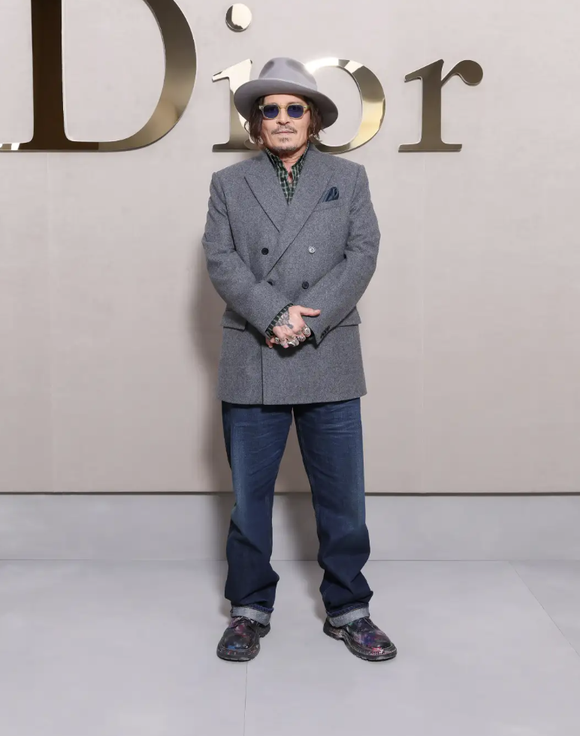 新木優子は、プリントがあしらわれたホワイトシルクシャツとスカートを着用。ジョニー・デップは、グレーウールのダブルブレスト ピークドラペルジャケットに、グリーンのチェックをあしらったコットンシャツ、そしてブルーのデニムパンツを合わせたルックを披露。「DIOR」のアクセサリーも着用した。