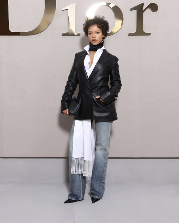 テイラー・ラッセルは、ホワイトのコットンシャツ、ホワイトのシルクスカーフ、ブルーのコットンパンツの上に、ブラックレザー「バー」ジャケットを着用。「DIOR」のアクセサリーも身に纏った。