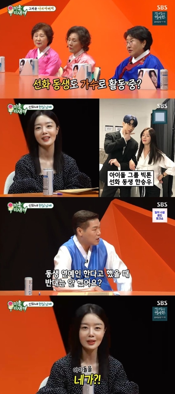 彼女の弟はVICTON出身のハン・スンウ。今回、兄妹が一緒に撮った写真が公開され、その優れたビジュアルが感嘆の声を誘った。「“ビジュアル兄妹”として話題を集めたが、弟が芸能人になりたいと言った時、反対しなかったのか」という質問にソナは、「私は反対した。『(まさか)あなたが?』と思ったけど、すごく上手だった」と答え、笑いを誘った。