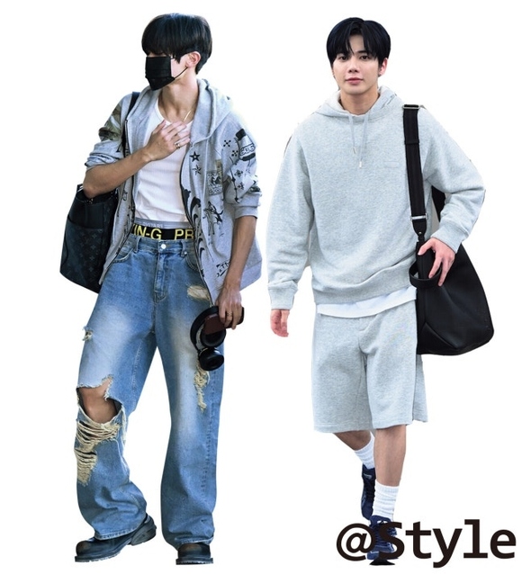 TOMORROW X TOGETHERのテヒョンは、グレーのセットアップでリラックスしたムードを最大化させた。インナーとして着用しているホワイトのTシャツと靴下でトーンを明るくすると、軽やかでスポーティーな雰囲気が演出できる。大きめのショルダーバッグひとつでナチュラルな彼氏ルックが完成した。