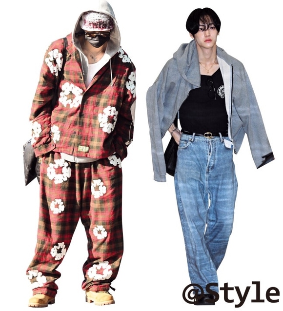 ファッショニスタとして注目を集めるENHYPENのニキ。グレーのパーカーをインナーにし、チェックのセットアップを着こなしたレイヤードスタイルが目を引く。大きなプリントとレッドとグリーンカラーのチェックが存在感を放ち、ワークブーツでバランスを取り、ストリートファッションを仕上げた。ポイントを大胆に加えたスタイリングで、ステージ衣装のように華やかだ。