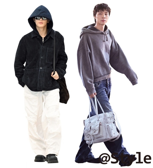 濃いネイビーカラーのパーカーとスウェードジャケットに、ホワイトのカーゴパンツを合わせ、対比させたNCTのマーク。顔を覆う深めのフードとミラーレンズのサングラスでクールなムードを演出した。さらに大きめのショルダーバッグで空港ファッションの実用性まで兼ね備えた。太めのソールのシューズで重みを持たせたのも印象的だ。