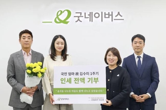 写真=グッドネイバーズ故人の息子チョン・ミョンホさん&ソ・ヒョリム夫婦は、キム・スミさんの1周忌を迎え、意義深い寄付を行った。23日、ソウル永登浦(ヨンドゥンポ)区のグッドネイバーズ会館で、「故キム・スミ 追慕寄付伝達式」を開催した。この寄付金は、故人の生前の日記を綴った本「私は嘆願する、私を殺す全てのことについて」の印税収益金で用意されたもので、「故キム・スミ 奨学支援事業」を通じて韓国国内の危険な状況に置かれている家庭の児童を対象とした奨学金および生活費として支援される。
