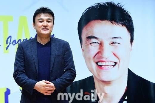 写真=マイデイリー DBパク・チュンフンは4日、ソウル中(チュン)区アートセンター会議室にて、自身のエッセイ「後悔しないで」の出版記念記者懇談会を開催した。進行は、ピアノ演奏家兼作曲家のムン・アラムが担当した。