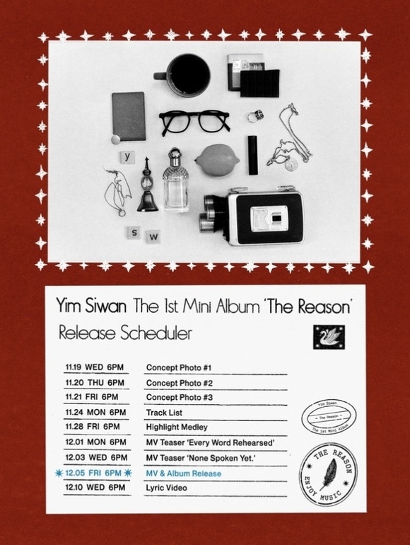 SMエンターテインメント 11月18日午後6時、SMArt公式アカウントに掲載されたイム・シワン初のソロアルバム「The Reason」(ザ・リーズン)のスケジュールポスターには、イム・シワンの趣向を垣間見ることができる様々な小物とともに、ティーザーコンテンツのオープン日程が記されている。