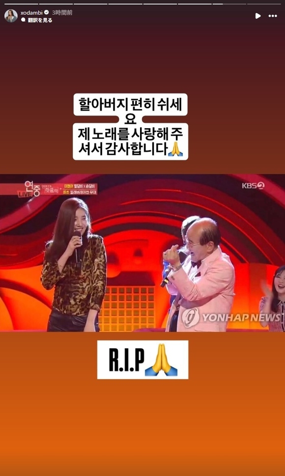 写真=OSEN DB、放送キャプチャソン・ダムビは昨日(17日)、「おじいさま、安らかにお休みください。私の歌を愛してくださり、ありがとうございます」と述べた。