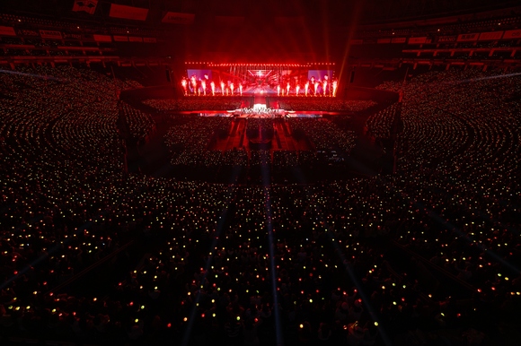 公演は会場のあちこちからメンバーが登場し、スタート。車から登場するメンバーやステージ上、花道からなど、会場のいろいろな箇所からメンバーが登場するたびに会場が壊れてしまうのではないかと思うくらいの歓声に包まれた。続いて「HBD」「THUNDER」をエネルギッシュに披露。今年の5月にリリースされたこの2曲は日本の公演では初めて披露され、会場のボルテージは一気に上がった。