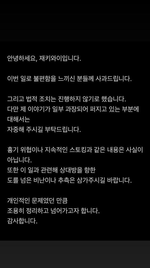彼女は自身の話が一部誇張されているとし、「凶器での脅迫や持続的なストーキングは事実ではない」とし、「相手に対する度が過ぎた批判や推測はお控えください。個人的な問題だっただけに、内密に解決しようと思います」と付け加えた。