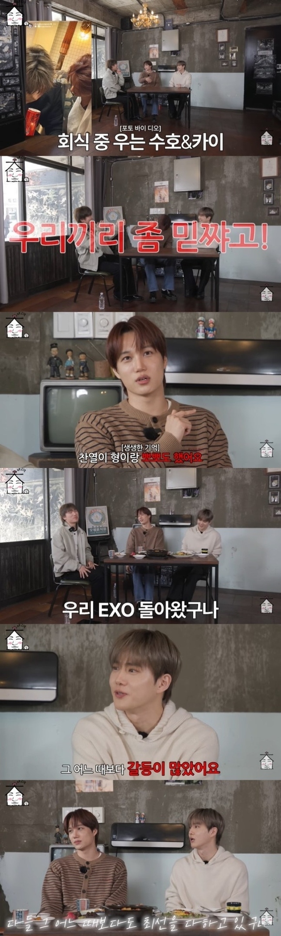 公演後の打ち上げエピソードも公開された。以前、スホとカイが泣いている写真が話題になったが、カイは「スホ兄さんがかなり飲んでいた。写真では僕も泣いているように見えるが、実は泣いていない。兄さんが僕に寄りかかって泣いていた」とし「気分が良すぎて、普段はワインしか飲まない人なのに、爆弾酒をガンガン飲んでいた。それでテンションが上がって、一人ひとり抱きしめながら、(テーブルを叩いて)『僕たち同士、信じ合おうよ!』と言っていた」と暴露した。