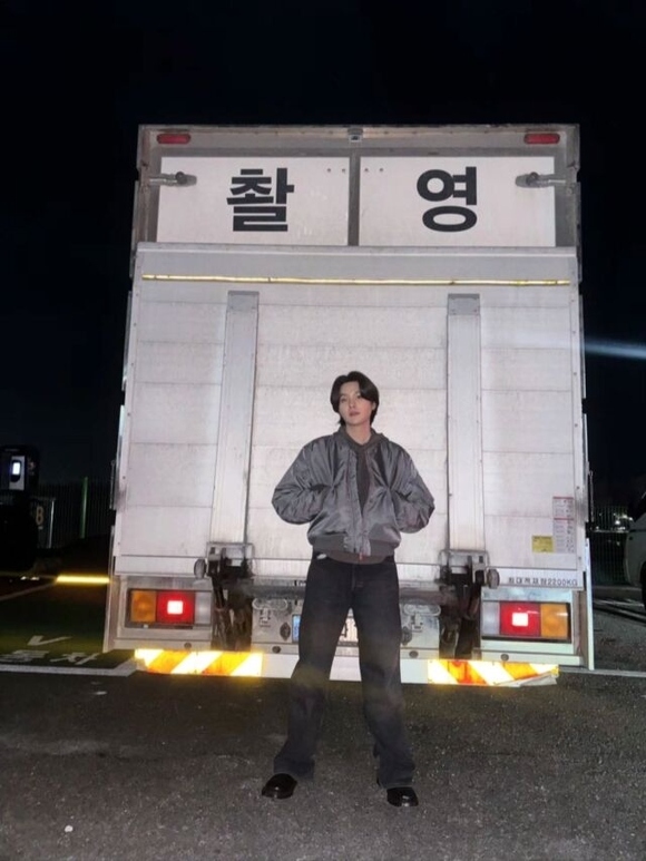彼は、大型トレーラーの後ろに立ってポーズをとっている。ブラウンカラーのパーカーにグレーのジャンパーを着ており、抜群のビジュアルを誇っている。