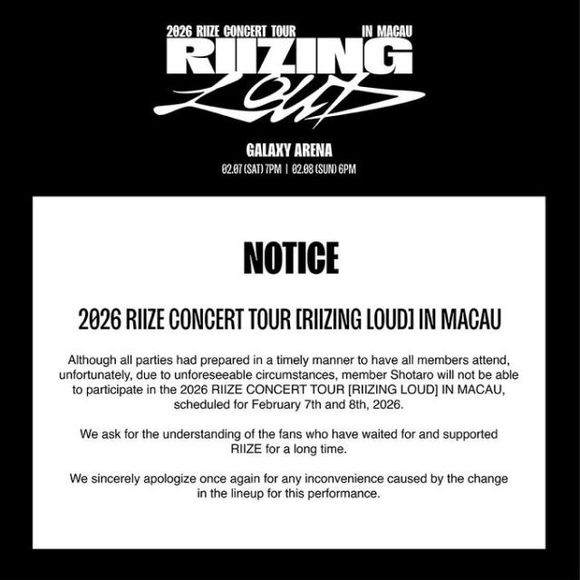 写真=マイデイリー DBマカオ公演の制作会社は本日(6日)、公式SNSを通じて、RIIZEの初のワールドツアー「RIIZING LOUD」のマカオ公演に、日本人メンバーのショウタロウが不参加になったと伝えた。