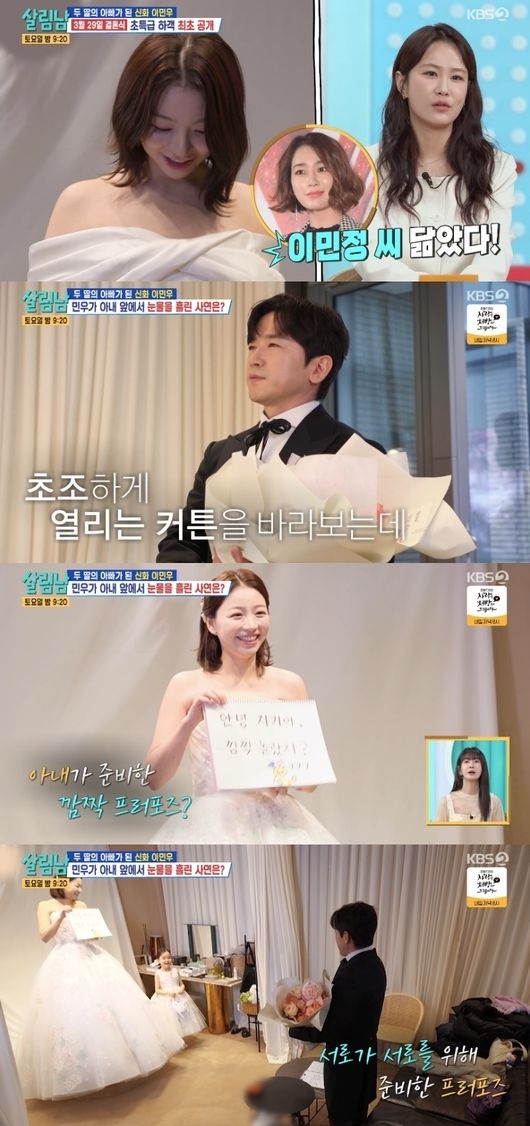 この日ミヌは結婚を控えて妻と一緒にドレスショップを訪れた。ドレスを着て出てきた妻は、出産してから3ヶ月しかたっていないことが信じられないスタイルで、感嘆を誘った。キム・ジミンも「本当に出産したの? イ・ミンジョンさんに似ている」と話した。