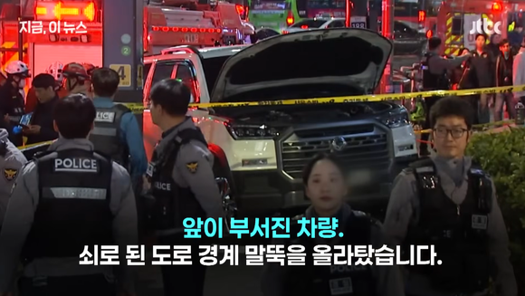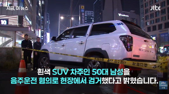 写真=JTBC News公式YouTubeキャプチャー現地の警察によると23日午後7時ごろ、弘大入口駅の4番出口付近で、飲酒運転の車が歩道に突っ込む事故が起こり、4人が巻き込まれた。うち2人は日本人で、1人は重傷、もう1人は軽傷だという。
