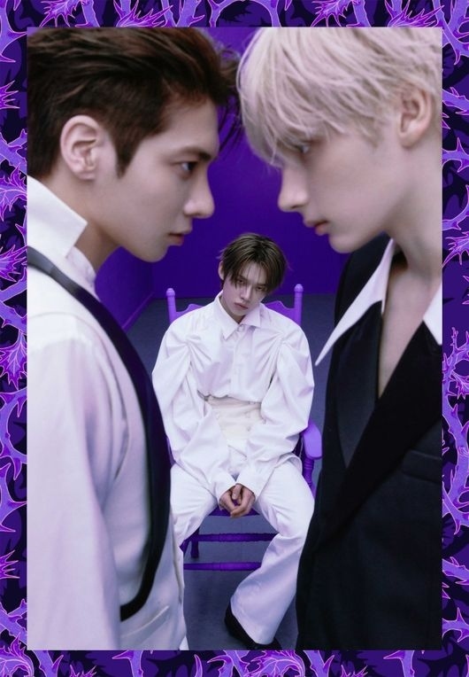 コンセプトフォトの中の彼らは、互いに異なる方向を凝視しながら張り詰めた雰囲気を演出している。紫色の壁紙の上のいばらの模様は空間全般に緊張感を加える。同じ場所にいながらも食い違う視線と距離感が関係の亀裂を暗示する。