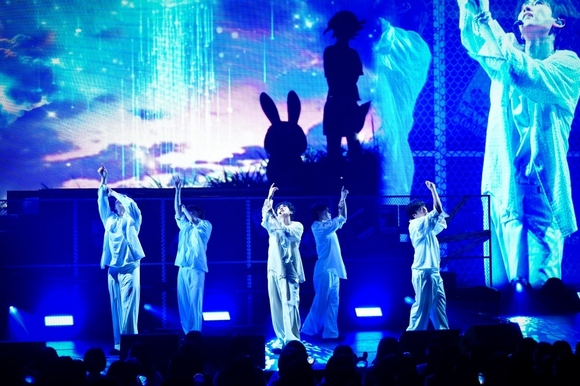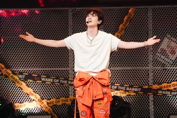 暗転した会場のスクリーンに「ウニョクうさぎ」が地球に降り立つ姿を彷彿とさせるポップなアニメーションのオープニング映像が流れ、サイレンの音と同時にスポットライトが点灯すると、その中には映像と同じオレンジのジャンプスーツを着たウニョクの姿が現れた。揃いのジャンプスーツを着たダンサーを引き連れて、ノリの良いヒップホップ調のダンスブレイクでスタート。そのまま「A-yo」につながると、得意のラップにのせてウニョクが軽やかにステップを踏んでいく。