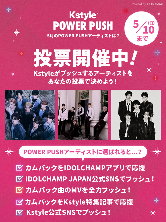 「Kstyle POWER PUSH」の投票期間は、4月28日(火)から5月10日(日)まで。5月もIVE、LE SSERAFIM、ZEROBASEONEなど、人気アーティストが続々とカムバック! あなたのイチ押しアーティストにぜひ投票してください。