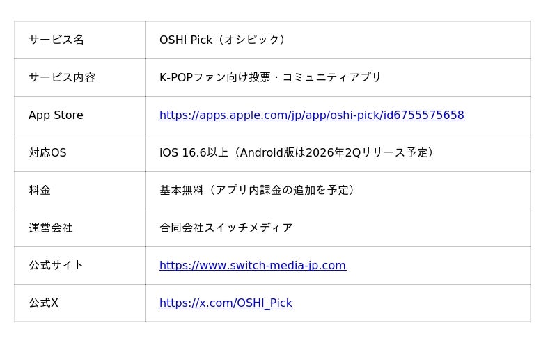 合同会社スイッチメディアは、K-POPファン向け投票支援アプリ『OSHI Pick』のiOS版を2026年3月1日より提供開始しました。MV共有や画像投稿など、アーティストへの応援活動でポイントが貯まる新しい仕組みを採用しています。リリース記念として、1位アーティストを新宿ユニカビジョンに掲出する無料投票イベントを4月1日より開催します。