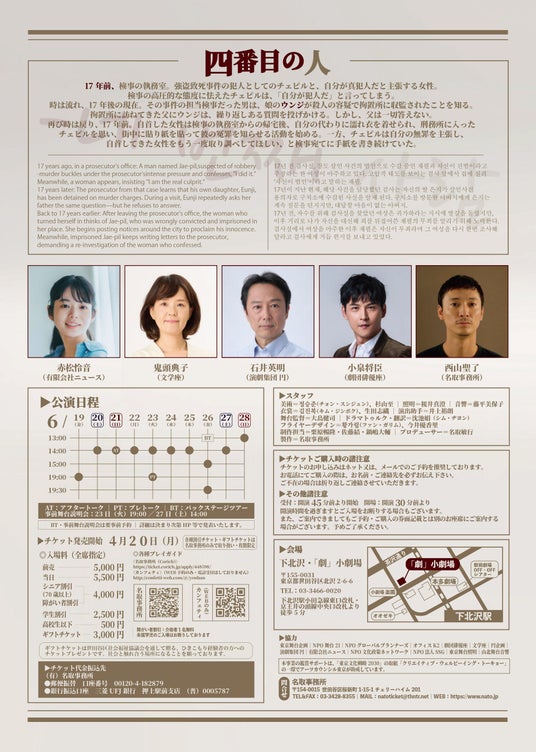 名取事務所主催、名取事務所・普遍的劇団 共同制作『四番目の人』が2026年6月19日 (金) ~ 6月28日 (日)に下北沢「劇」小劇場 (東京都世田谷区北沢 2-6-6)にて上演されます。 チケットはカンフェティ(運営:ロングランプランニング株式会社、東京都新宿区、代表取締役:榑松 大剛)にて発売中です。